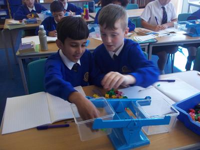 Year 6 using scales and multilink cubes to balance algebraic calculations